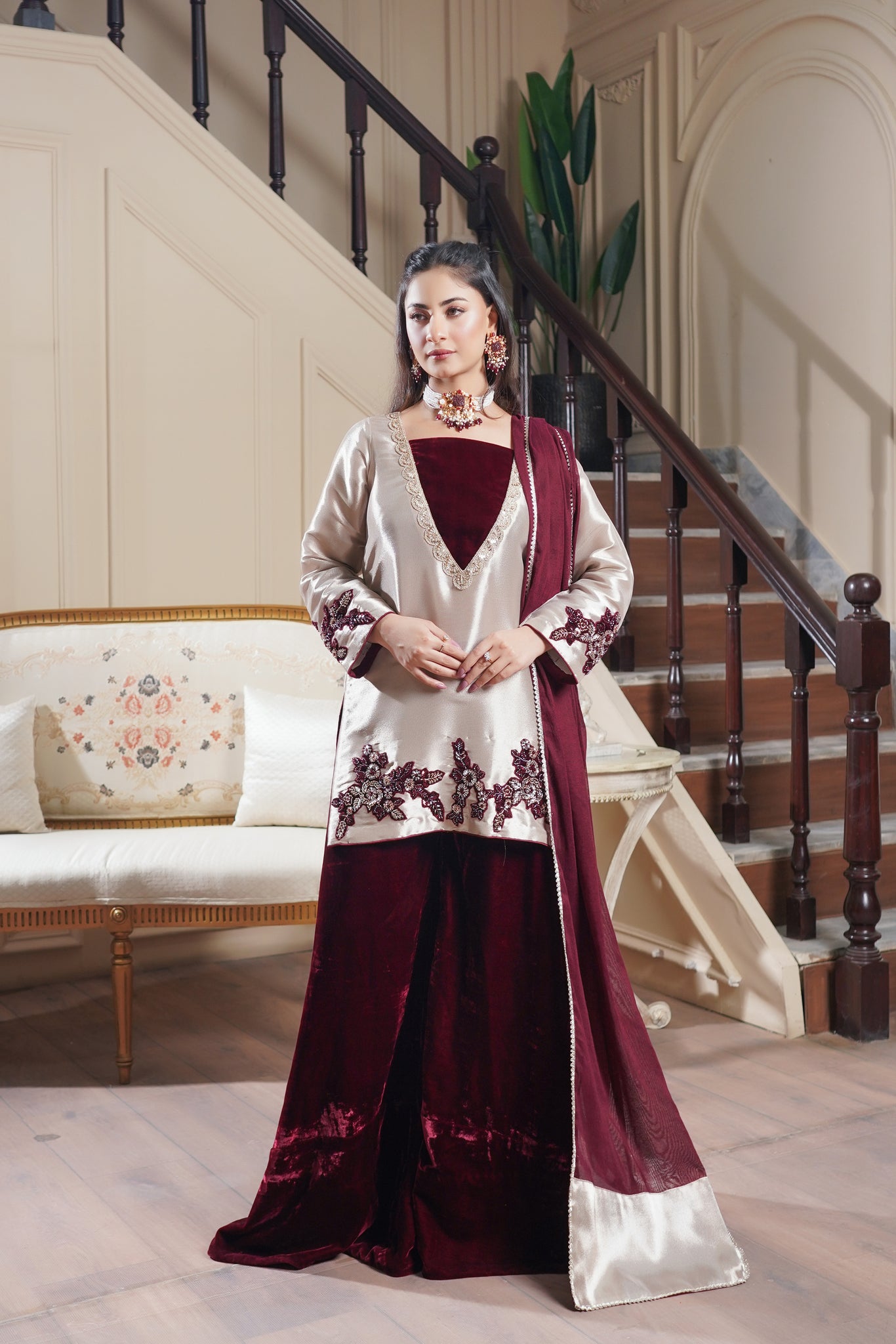 A rich, deep Maroon sharara paired with a contrasting, shimmering Champagne shirt features a striking...