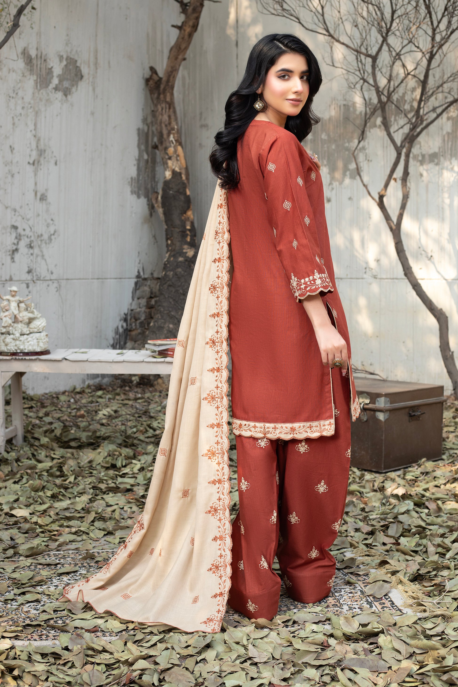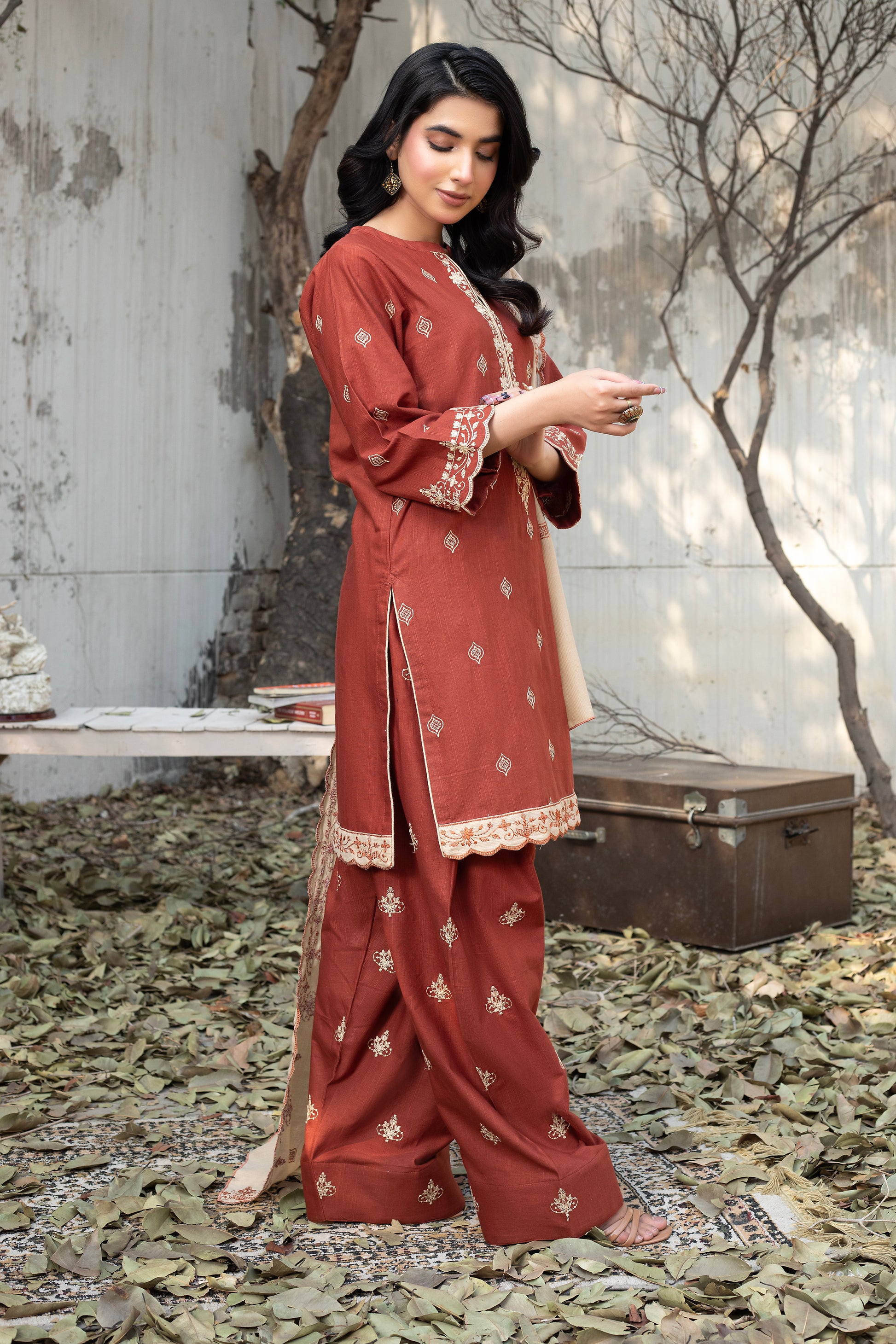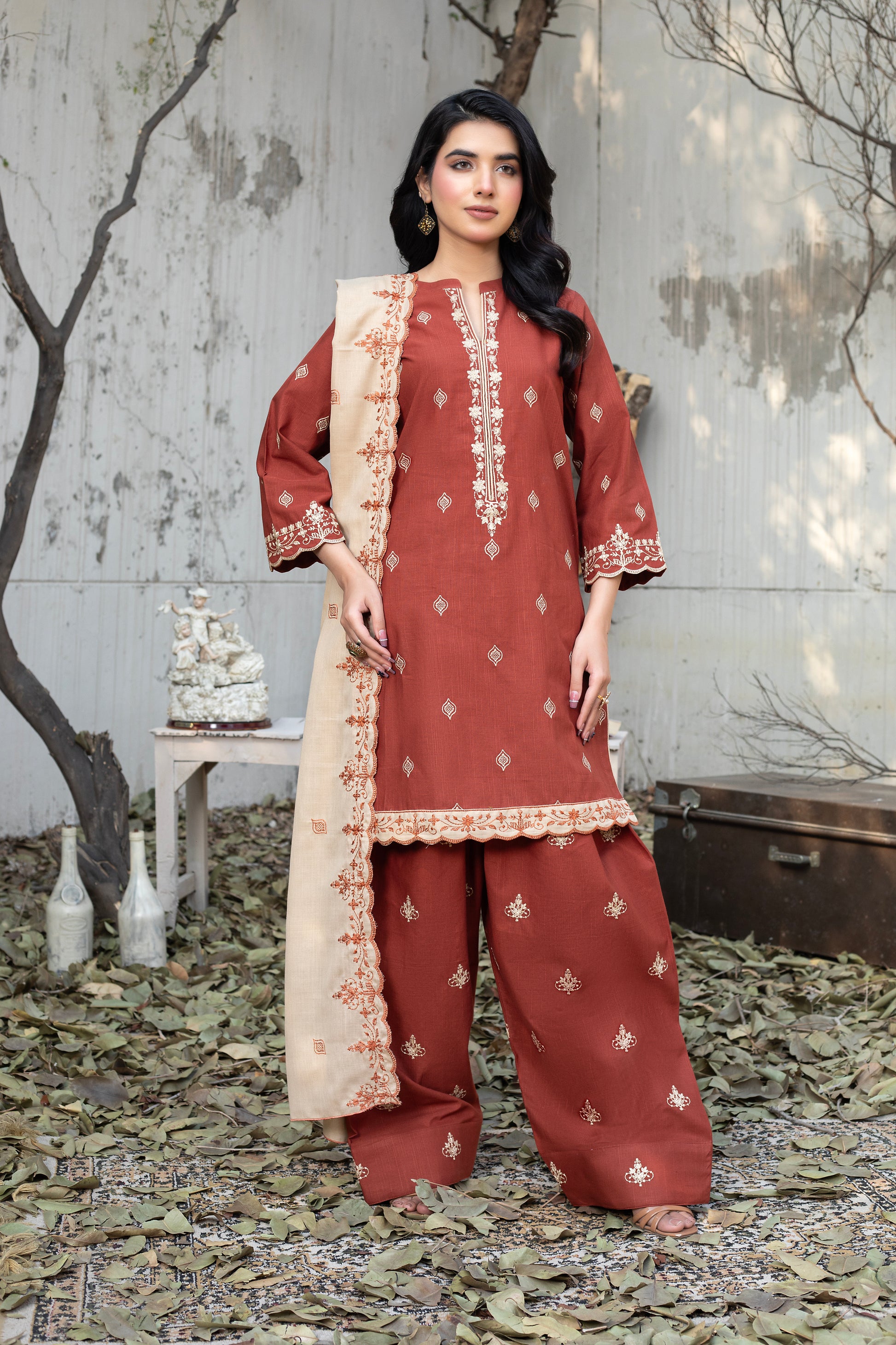 A beautifully crafted rust-colored 3-piece embroidered outfit features delicate thread embroidery along the neckline, sleeves, and hem, paired with subtle all-over spray for a refined look. The matching farshi shalwar carries coordinated embroidery, adding balance and grace to the complete look. Styled with a soft beige embroidered shawl, this outfit blends comfort with timeless beauty, making it perfect for family gatherings, festive dinners, or semi-formal events. Pair it with classic earrings and neutral sandals for an effortlessly graceful appearance.