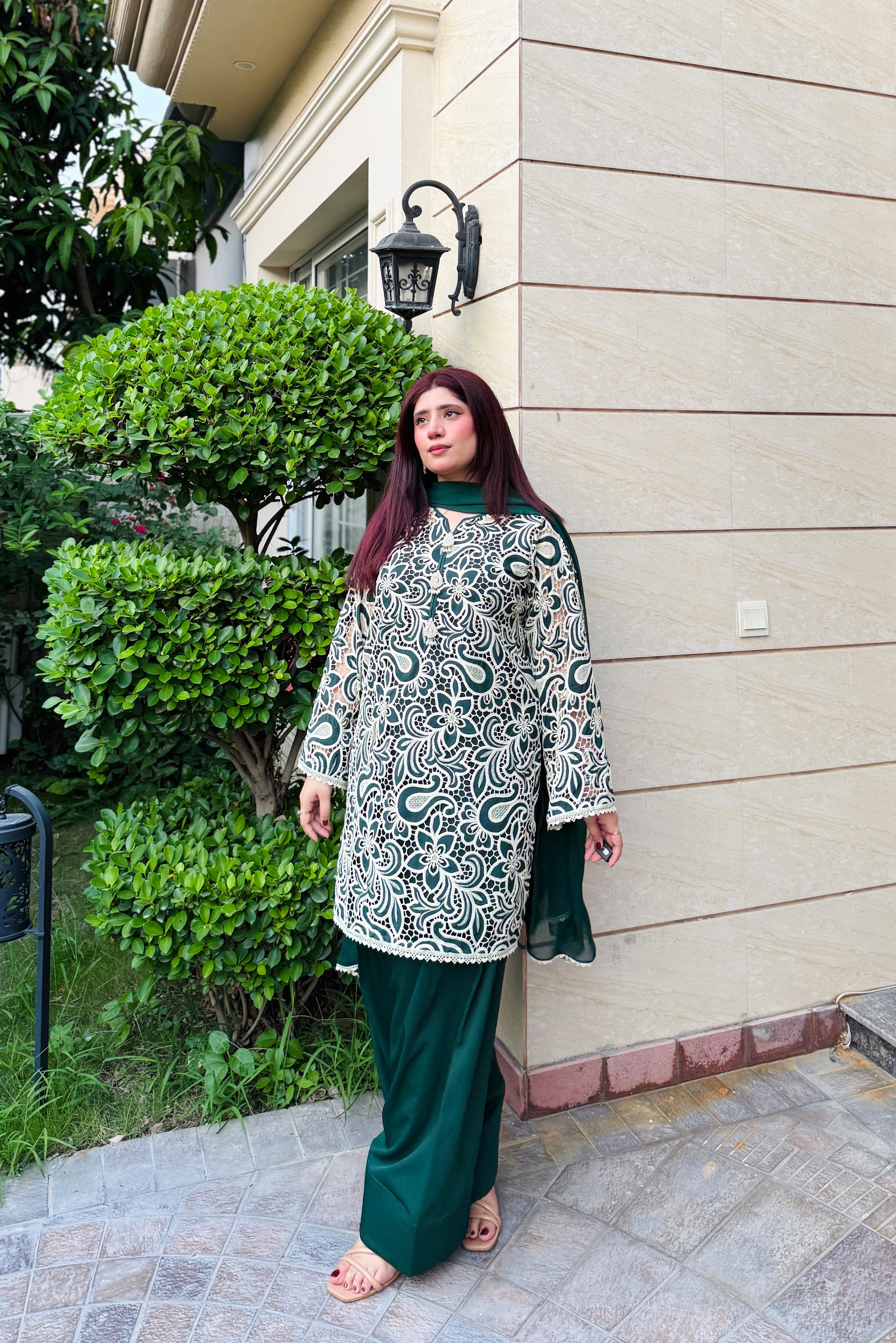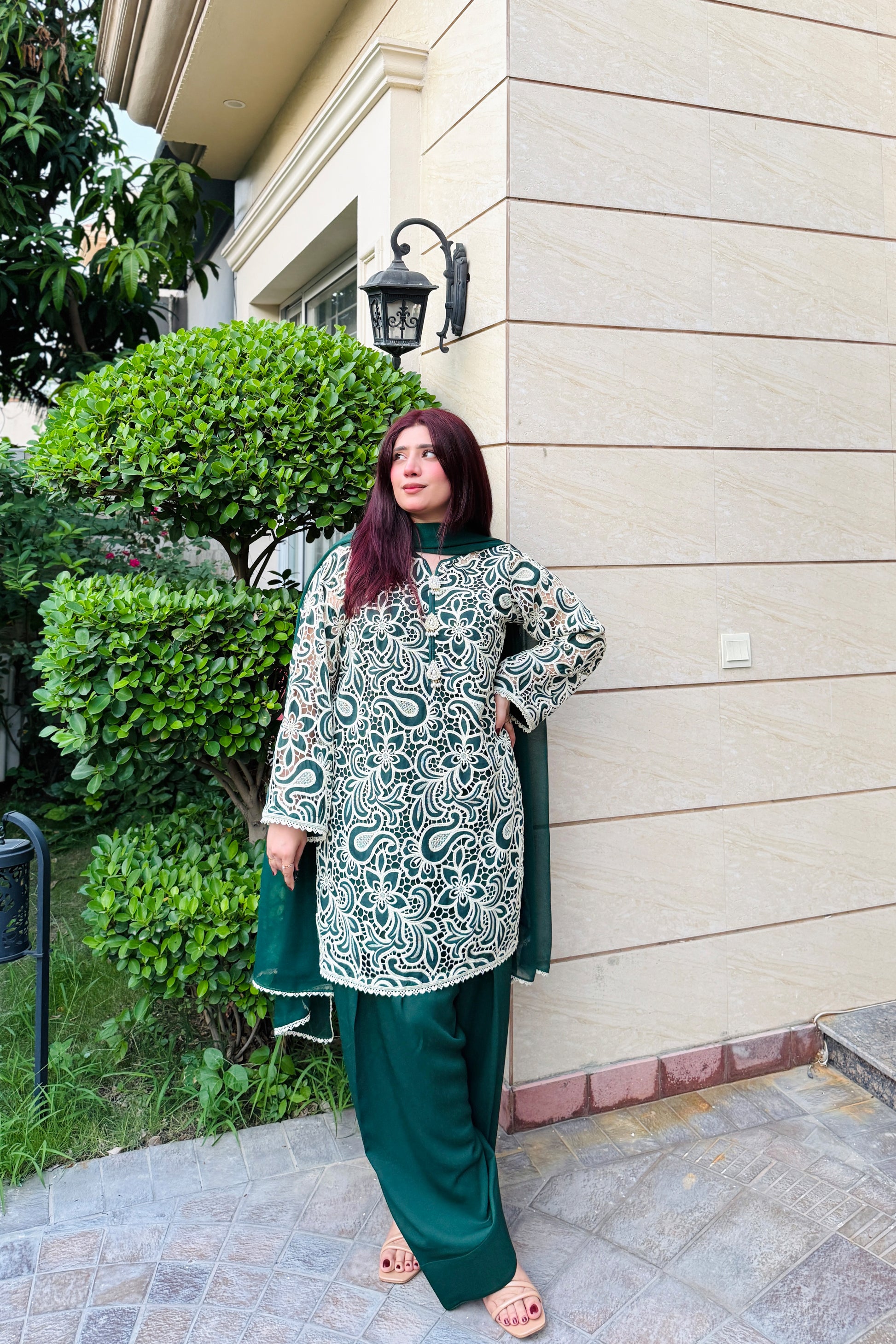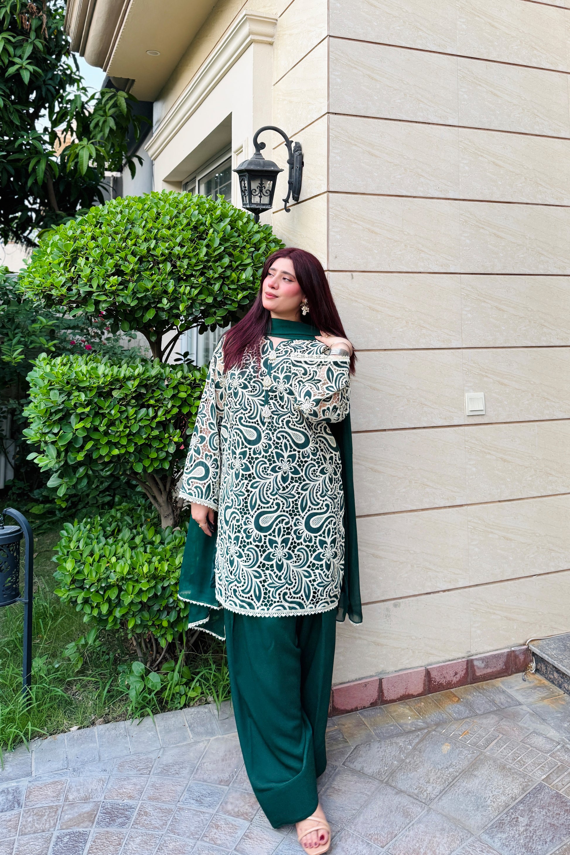 Step into timeless elegance with this deep emerald green 3-piece set. The short shirt is beautifully adorned with intricate white laser-cutwork in a floral and paisley-inspired pattern, giving it a refined yet modern look. Paired with a farshi shalwar and a matching chiffon dupatta, this outfit is perfect for mid-season gatherings, semi-formal dinners, or family events.
