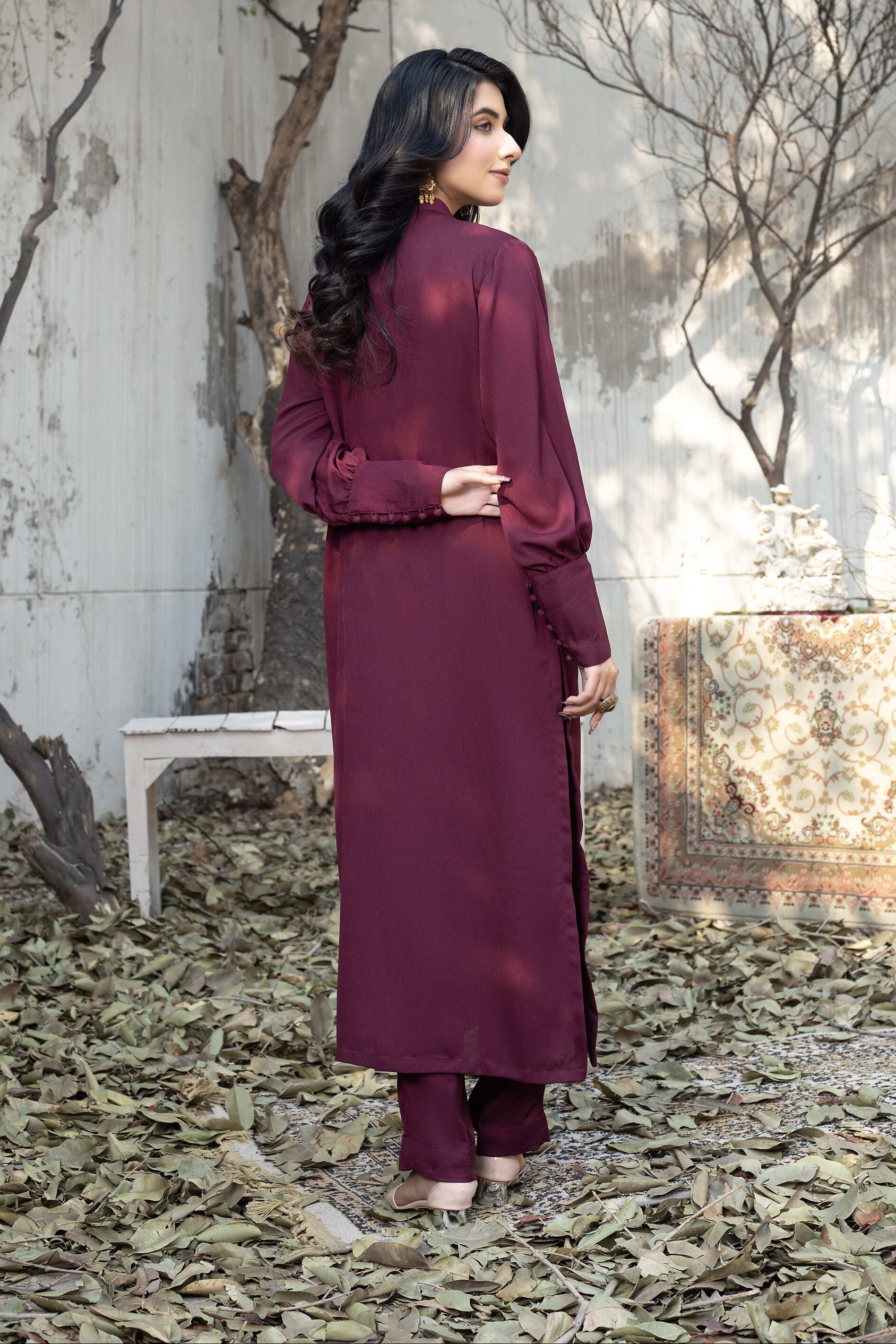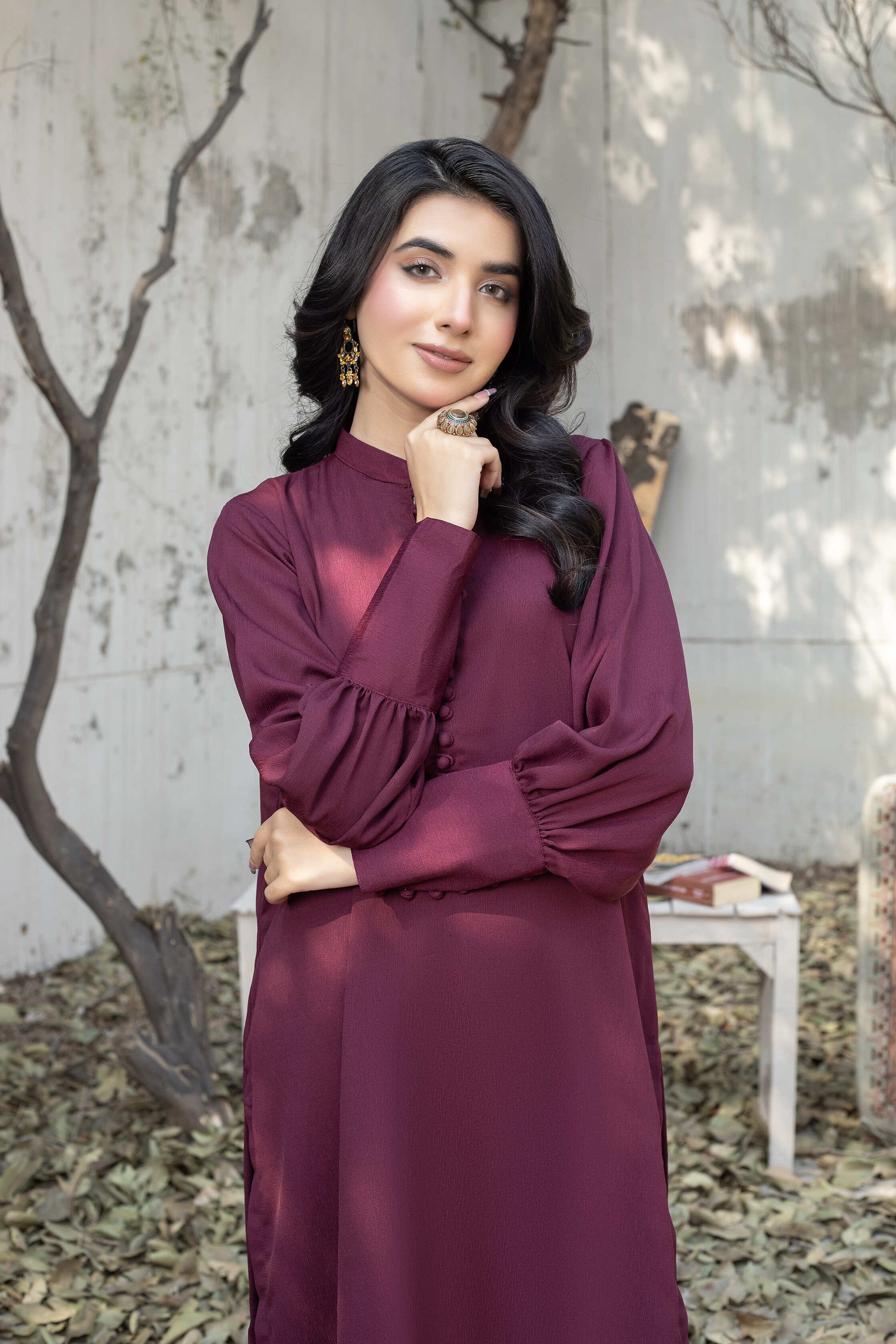 A rich plum-toned 2-piece outfit crafted to elevate your everyday elegance with effortless charm. The long, straight shirt features a chic band collar, a refined buttoned placket, and softly gathered sleeves that add a touch of sophistication. Paired with matching straight trousers, this ensemble blends comfort with a polished, graceful silhouette. Light, breathable, and versatile, perfect for casual gatherings, lunch meet-ups, or relaxed outings. Style it with delicate earrings and neutral sandals for a refined, minimal look.